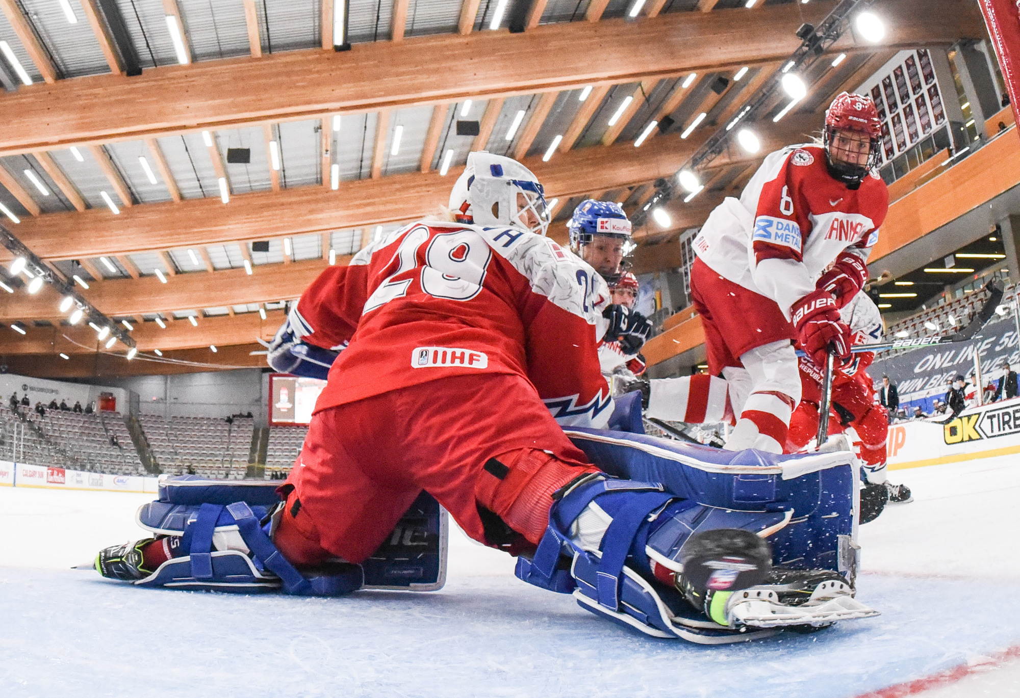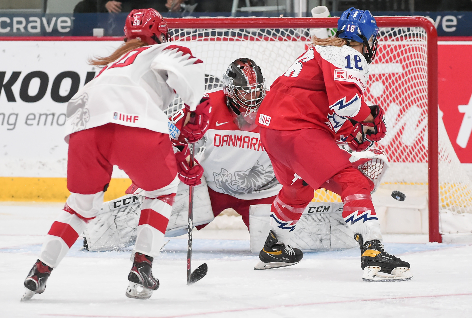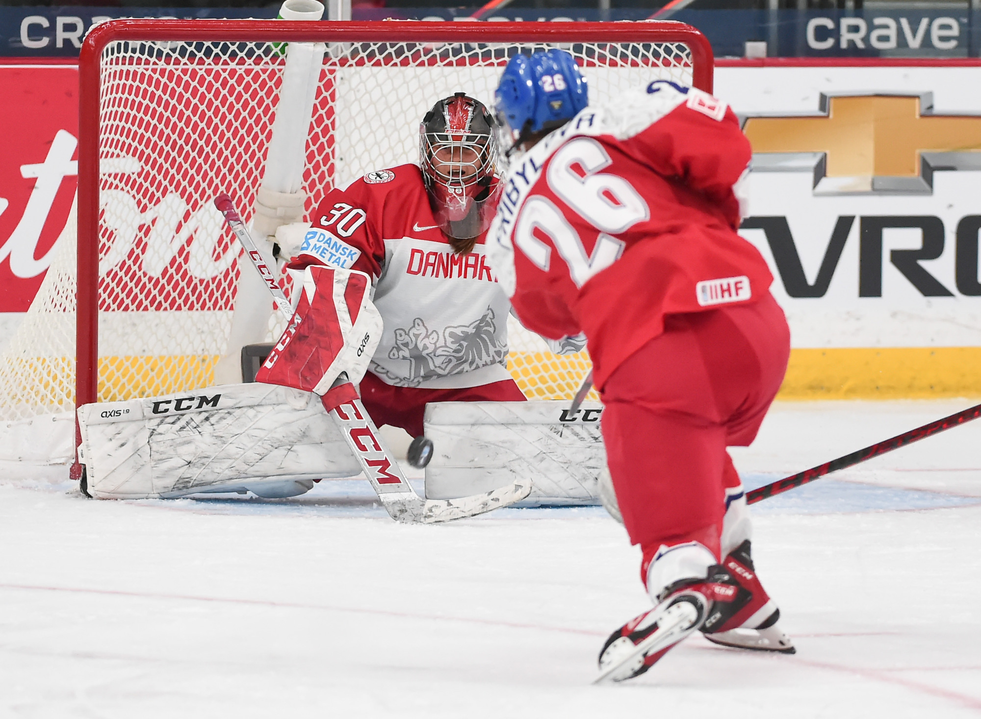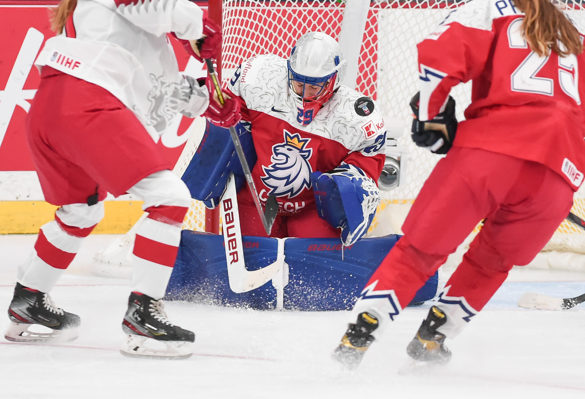 La gardienne de but étoile des Tchèques, Klara Peslarova, a été alerte quand c'était nécessaire, mais son homologue danoise Lisa Jensen a été beaucoup plus occupée à ses débuts au Championnat mondial féminin. Les Tchèques ont dominé 34-9 au chapitre des tirs au but.