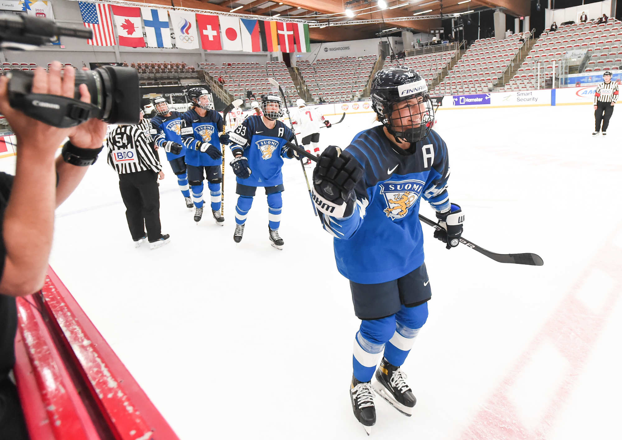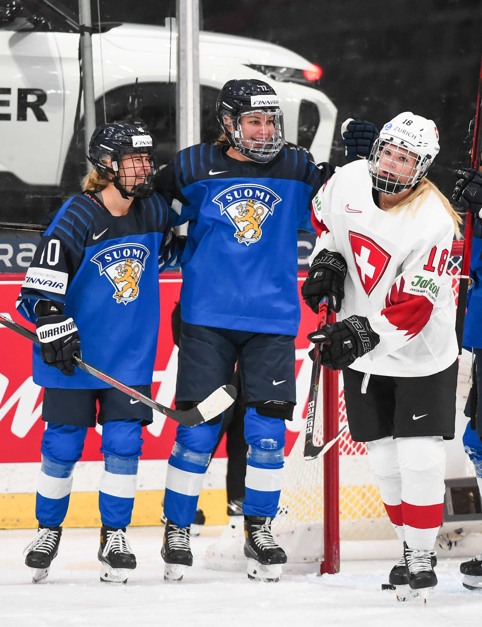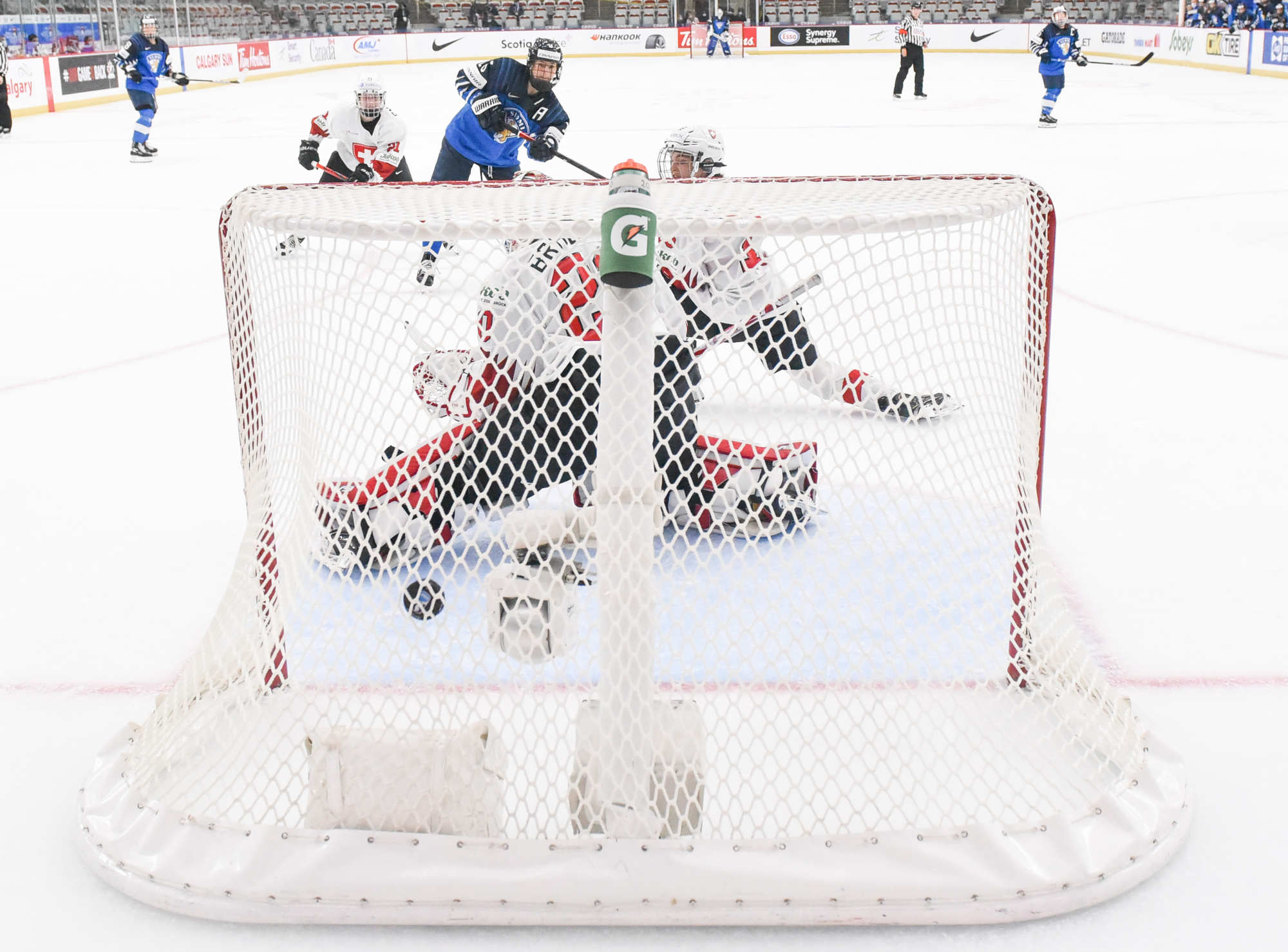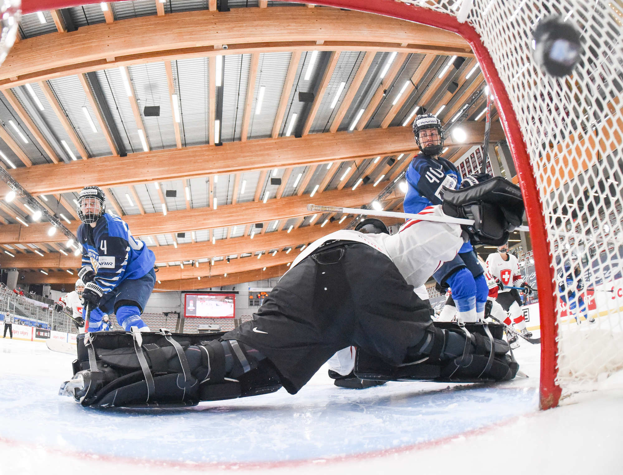 Petra Nieminen (16) a volé la vedette avec l’aide de ses coéquipières Michelle Karvinen (33) et Susanna Tapani (77) dans la victoire à sens unique de 6-0 des Finlandaises sur la Suisse au sein du Groupe A au Mondial féminin 2021 à Calgary.