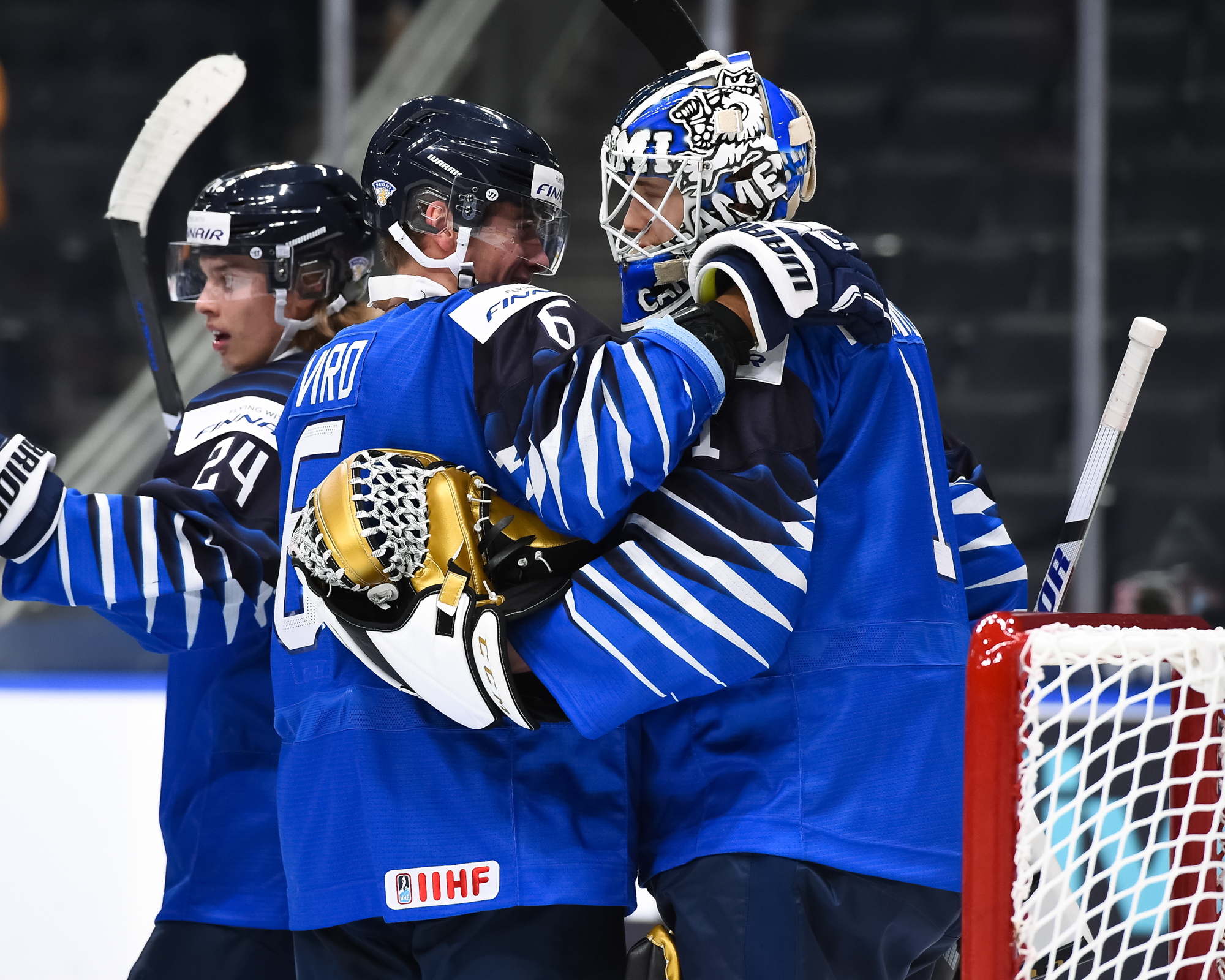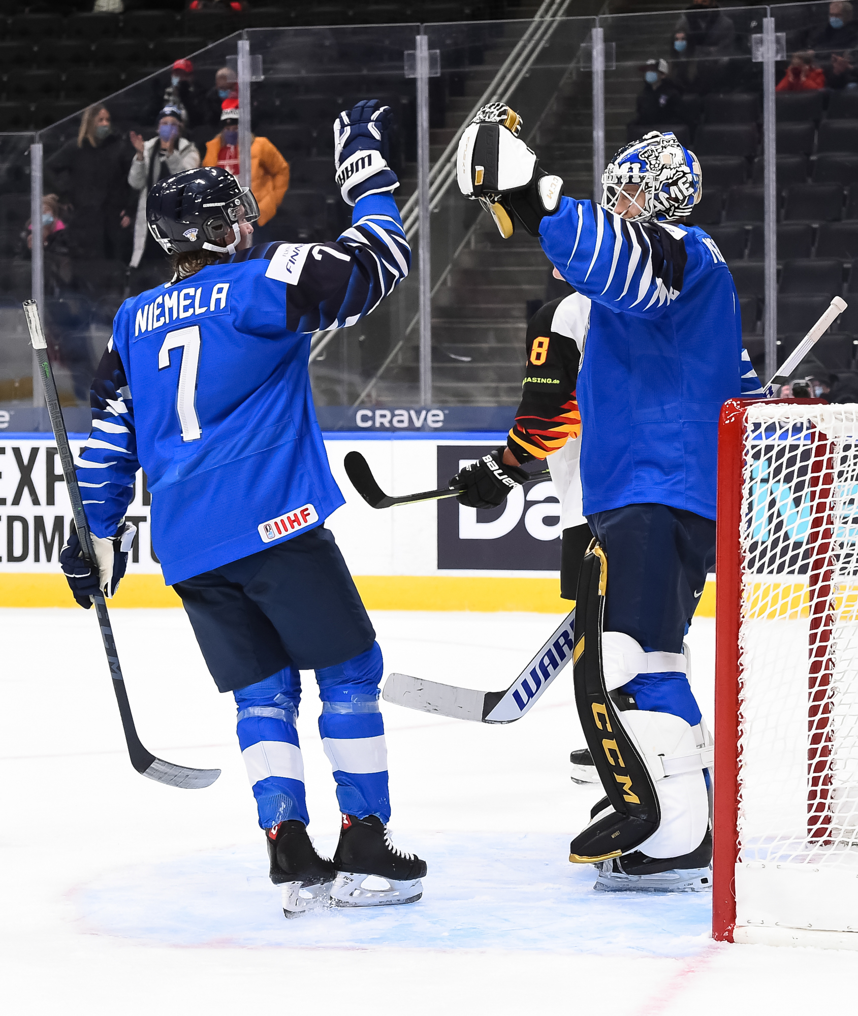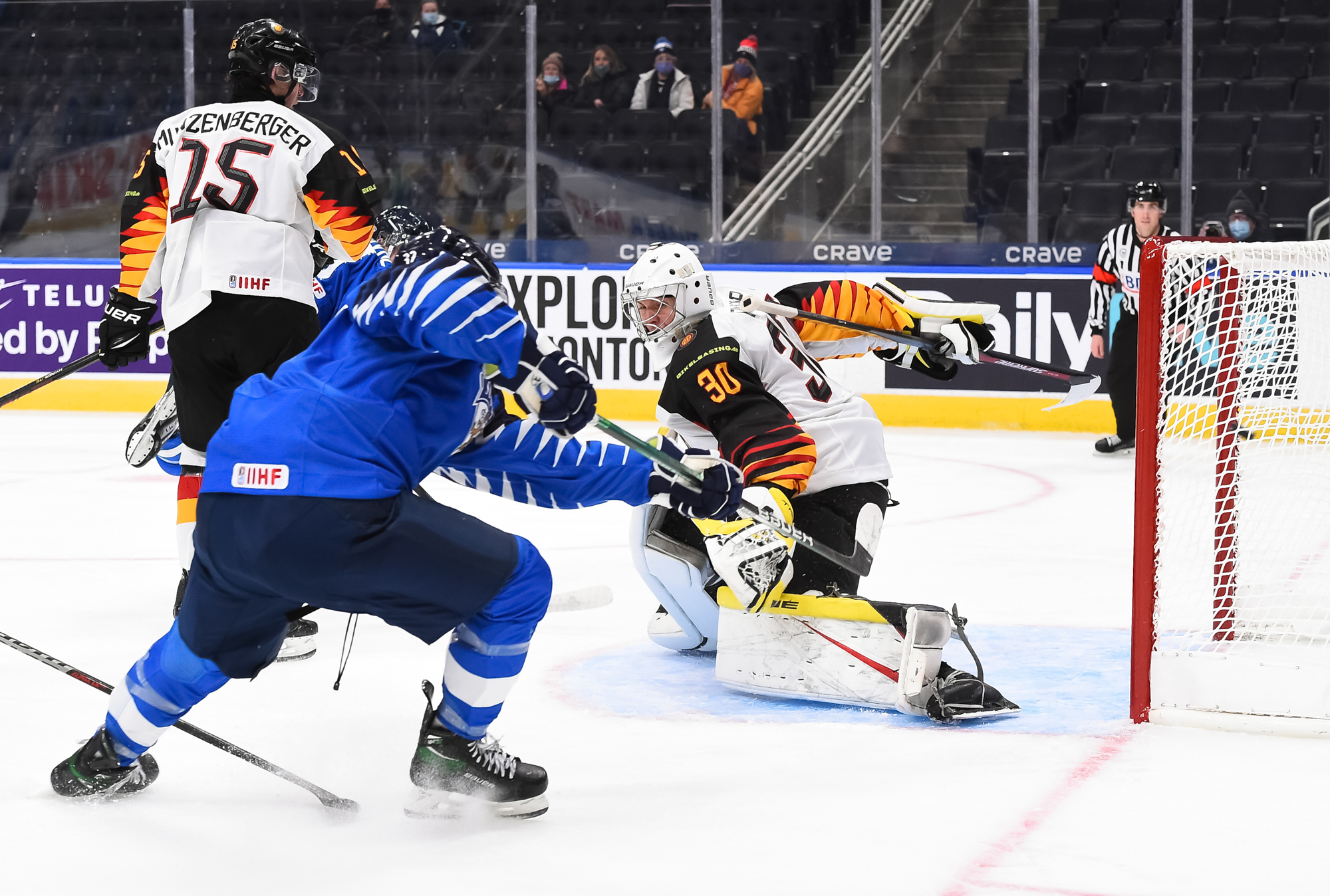 Leevi Merilainen, le gardien de but partant de 19 ans des Frontenacs de Kingston de la Ligue de l’Ontario a été solide à son premier départ dans un tournoi de l’IIHF en réalisant 23 arrêts. Son vis-à-vis, Nikita Quapp, qui évolue avec les Pinguine de Krefeld du championnat professionnel allemand (DEL) à l’âge de 18 ans et qui a disputé deux matchs au Championnat des moins de 18 ans au Texas au mois d’avril, a réalisé 19 arrêts à l’autre bout de la patinoire.