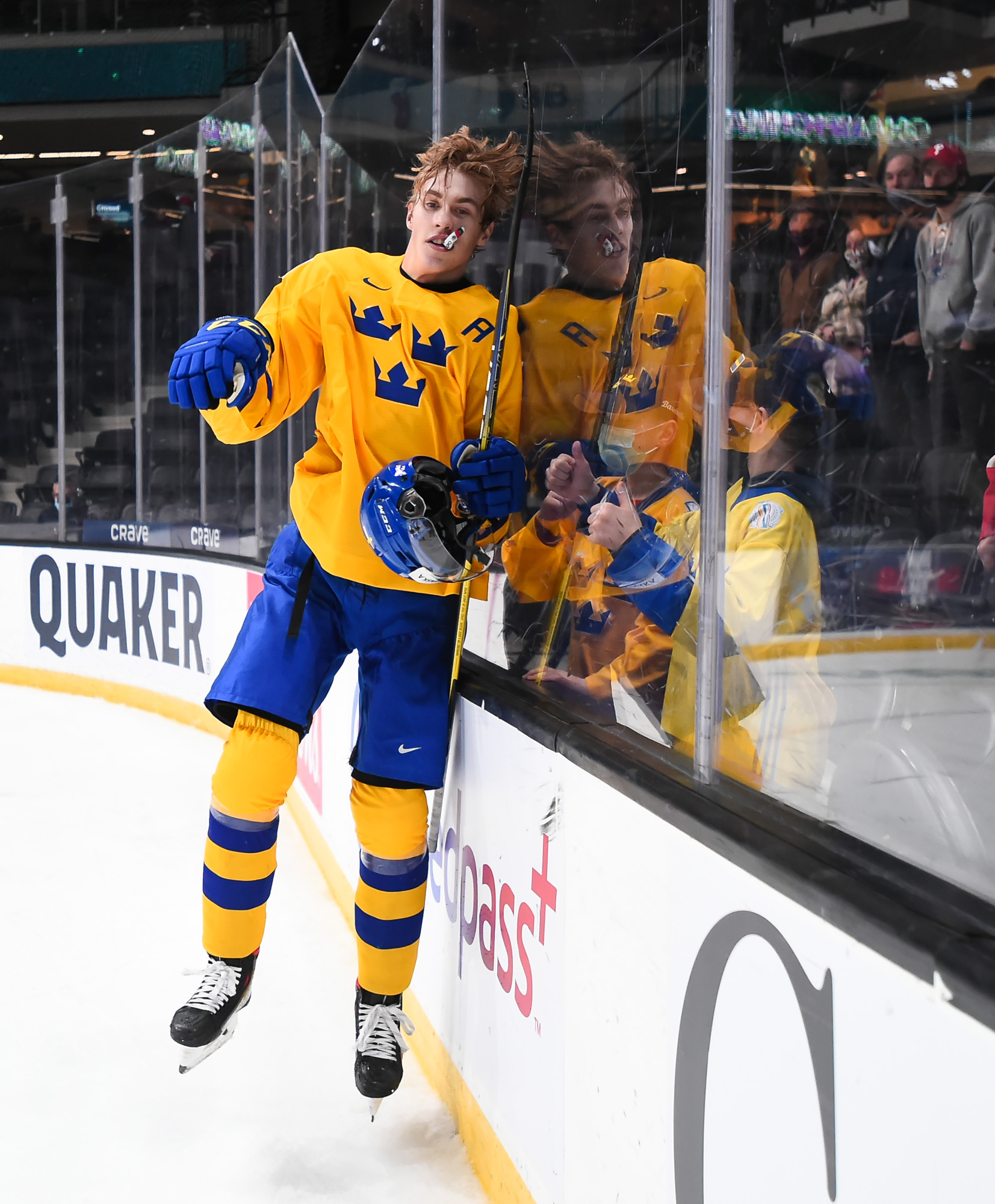 Plus tard dans la période, les Suédois se sont retrouvés à cinq contre trois pendant 43 secondes et ils ont à nouveau profité de leur occasion. Cette fois, le capitaine Emil Andrae s’est déplacé de la pointe vers le centre de la glace et il a attendu que son coéquipier Ake Stakkestad fasse écran à Askarov, puis il a tiré sous le gant du gardien pour donner une avance de 3-0 à son équipe.