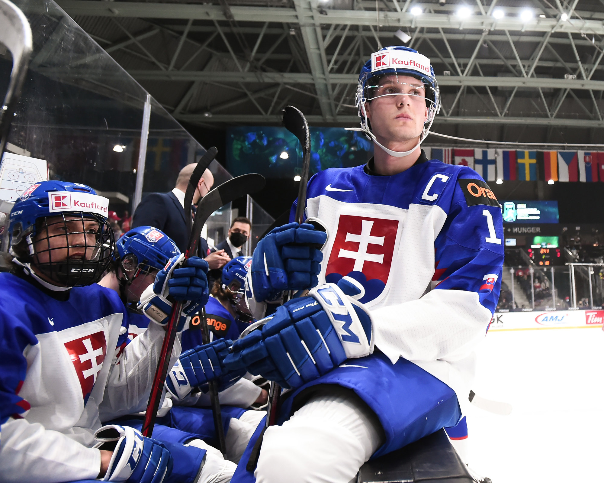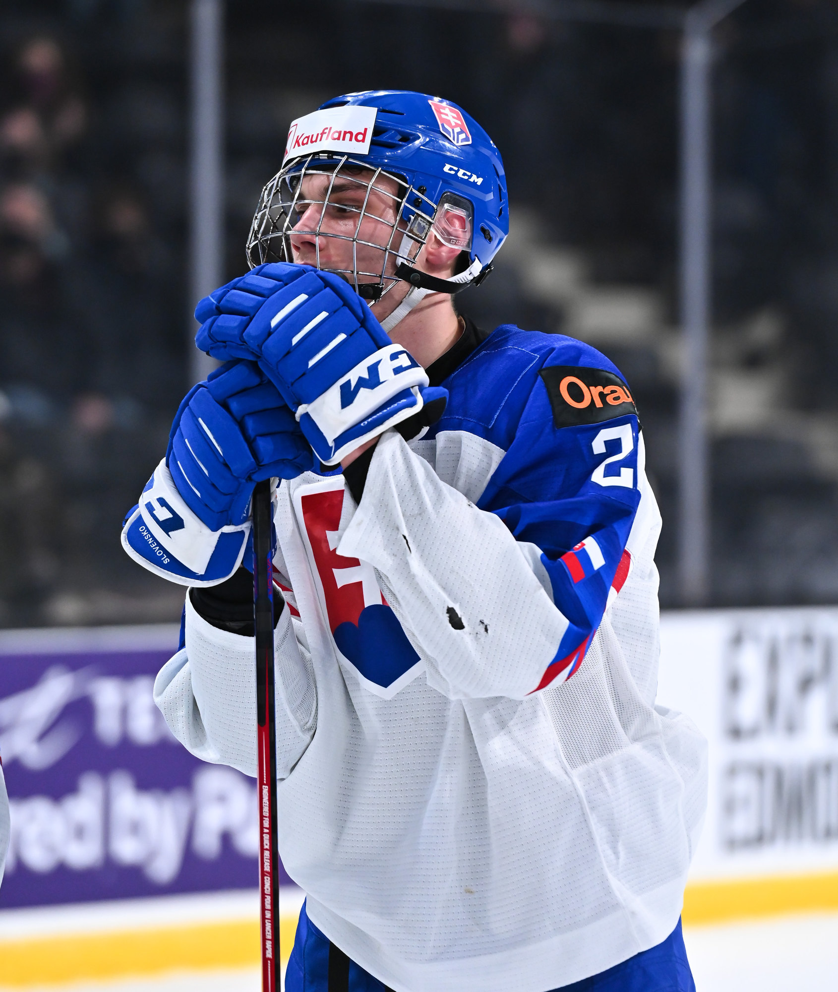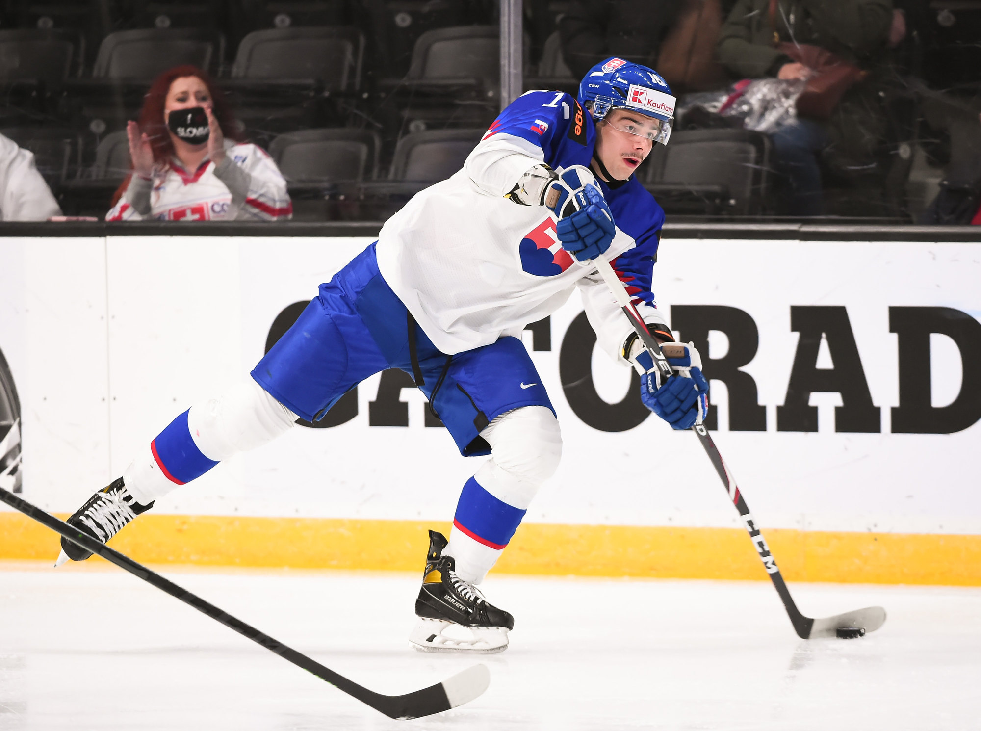 Juraj Slafkovsky de la Slovaquie saute dans les airs alors qu’il fait dévier la rondelle.