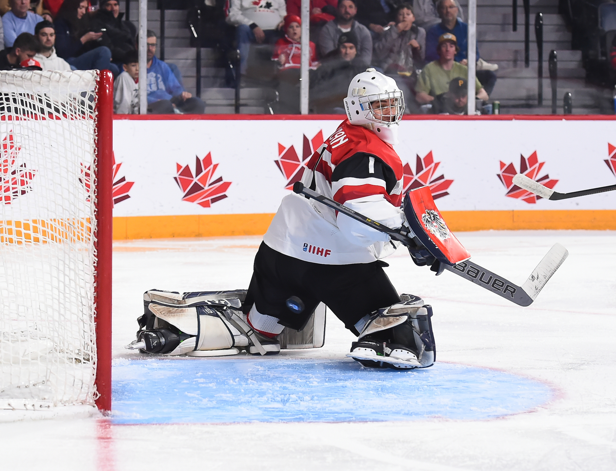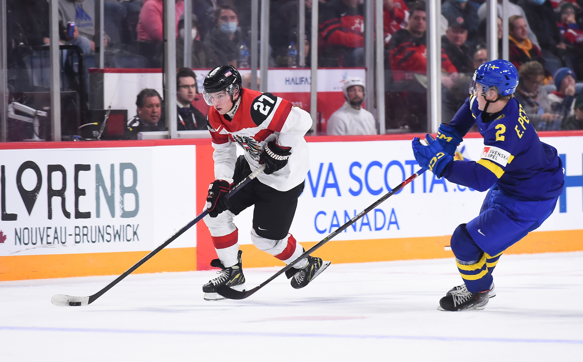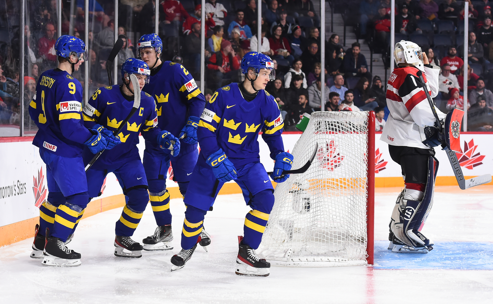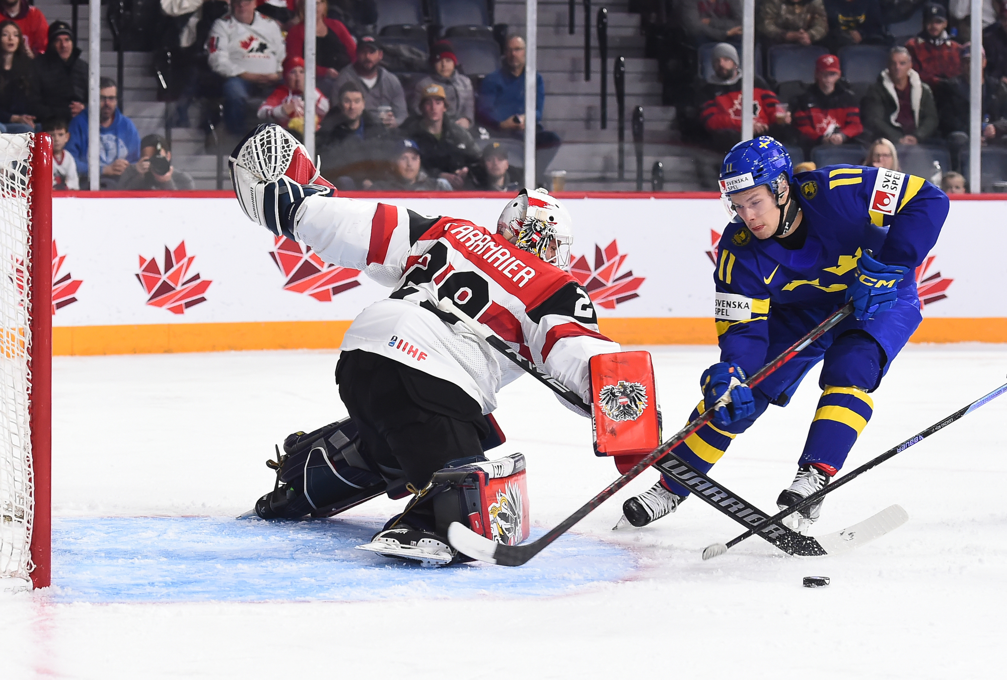 Lundi, ils n’ont toutefois pas été en mesure de lutter d’égal à égal avec les Suédois, qui ont fait circuler la rondelle à l’aide de passes solides, effectuées avec confiance. N’eut été de la formidable performance de Thomas Pfarrmaier, qui en était à ses débuts chez les U20, le pointage aurait été beaucoup plus élevé en début de rencontre. En effet, le gardien de but a donné des raisons aux partisans autrichiens de célébrer après quelques minutes de jeu quand il a glissé d’un côté à l’autre de son filet pour réaliser un arrêt étincelant du bloqueur sur ce qui semblait un but certain pour Filip Bystedt, alors que celui-ci s’était posté en retrait du jeu.