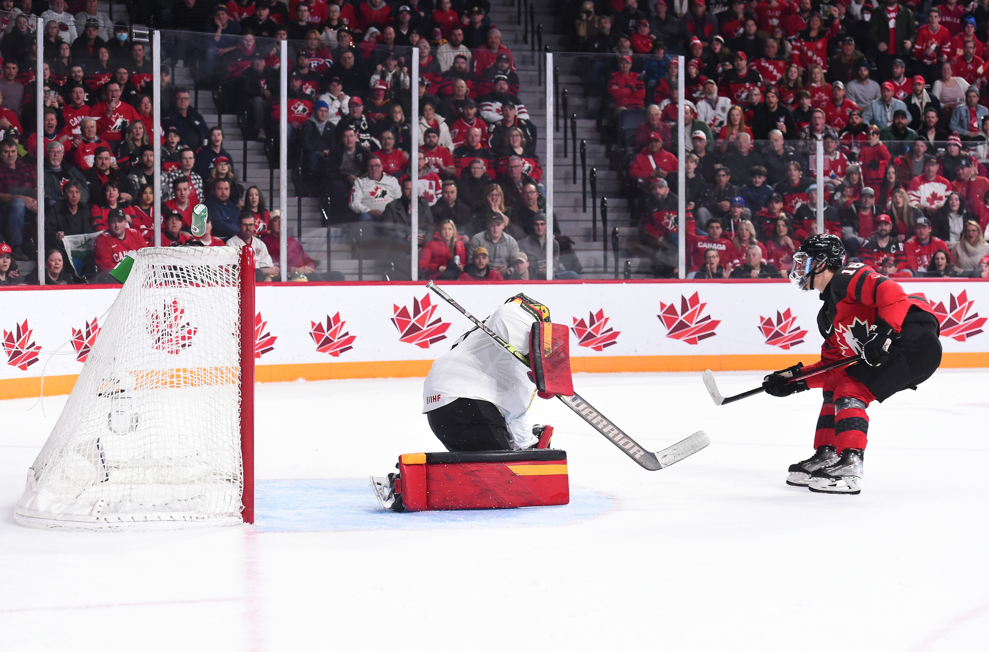Canada's Connor Bedard trouve le fond du filet en première période contre l’Allemagne.