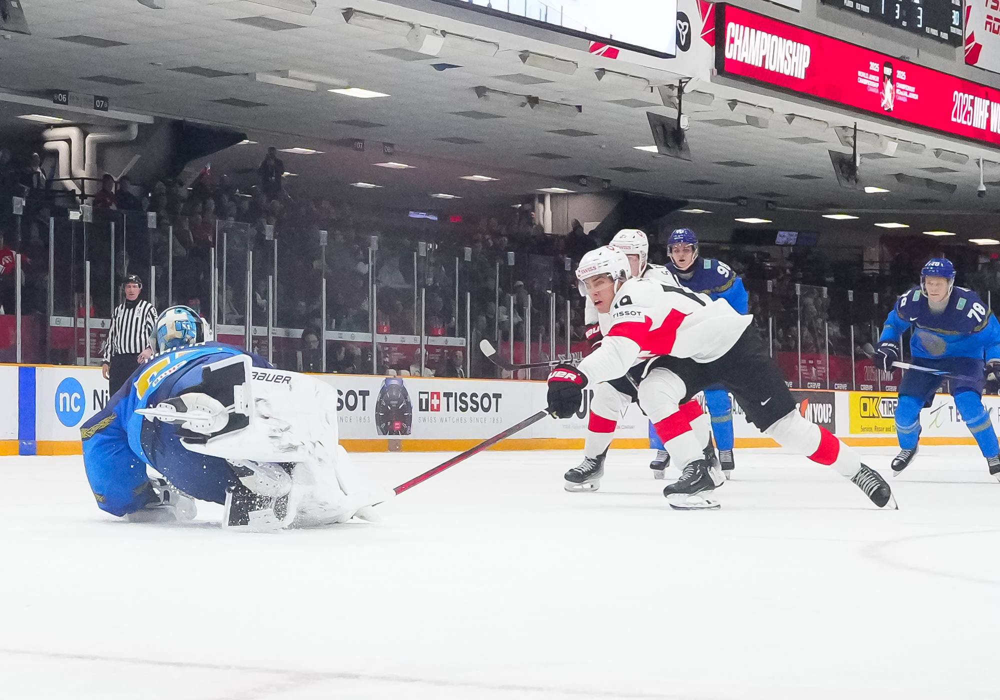 Robin Antenen a enfilé le but vainqueur en deuxième période. Simon Meier et Ludvig Johnson ont chacun inscrit un but et une mention d’aide, tandis qu’Eric Schneller a récolté deux passes. Avec Christian Kirsch devant le filet, les Suisses se sont signalés en y allant d’une solide prestation autant en défensive qu’à l’offensive, dominant le Kazakhstan 35-12 au chapitre des tirs en route vers leur premier gain du tournoi.