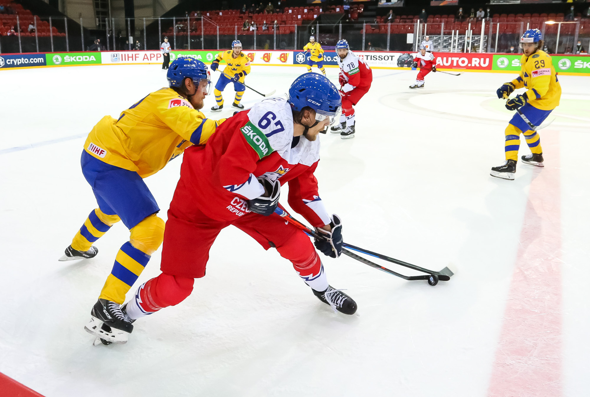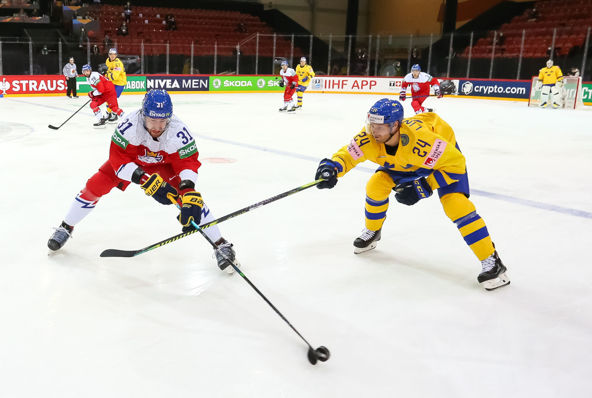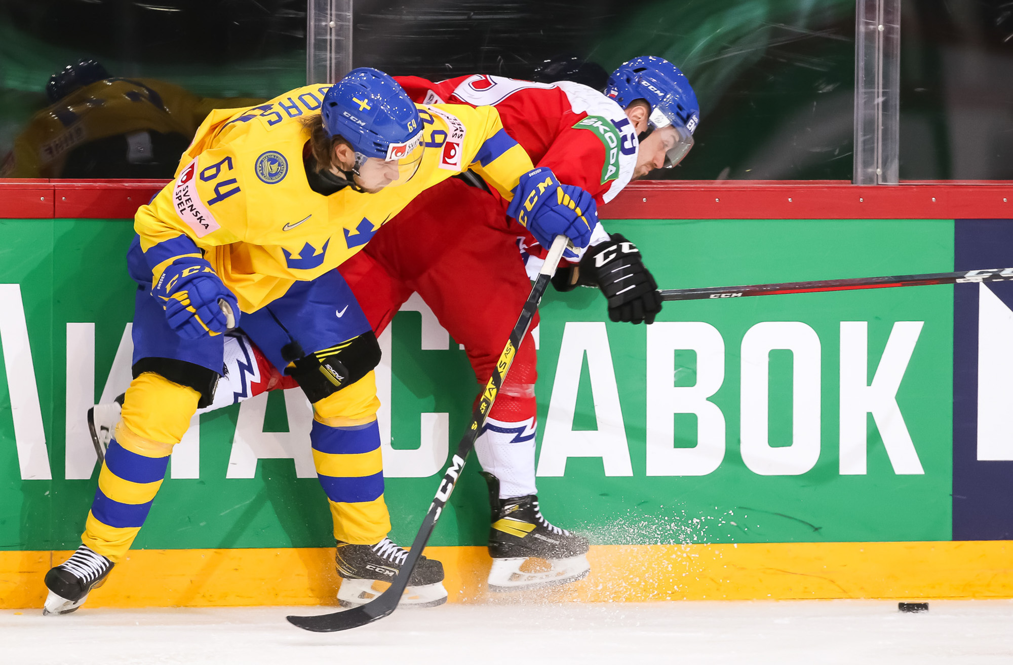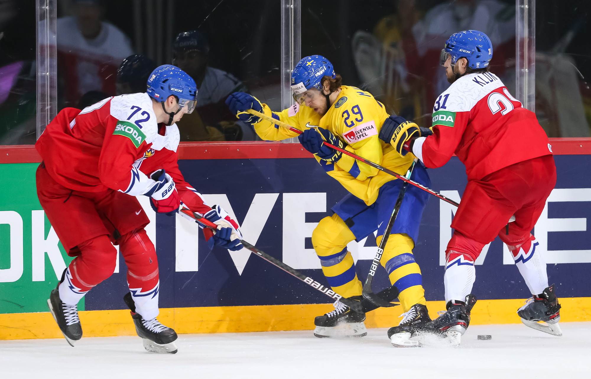 Pasaules čempionātā hokejā šovakar pirmo uzvaru pamatlaikā izcīnīja Čehija, kas vēl trešās trešdaļas sākumā atradās iedzinējos ar 0:2, tomēr spēja izmantot divus skaitliskos vairākumus trešās trešdaļas sākumā un rezultātu izlīdzināja, bet 49. minūtē Lukašs Kloks jau izvirzīja vadībā Čehiju. Zviedrijai atspēlēties neizdevās, bet čehi beigās iemeta ripu arī tukšos vārtos - uzvara ar 4:2.