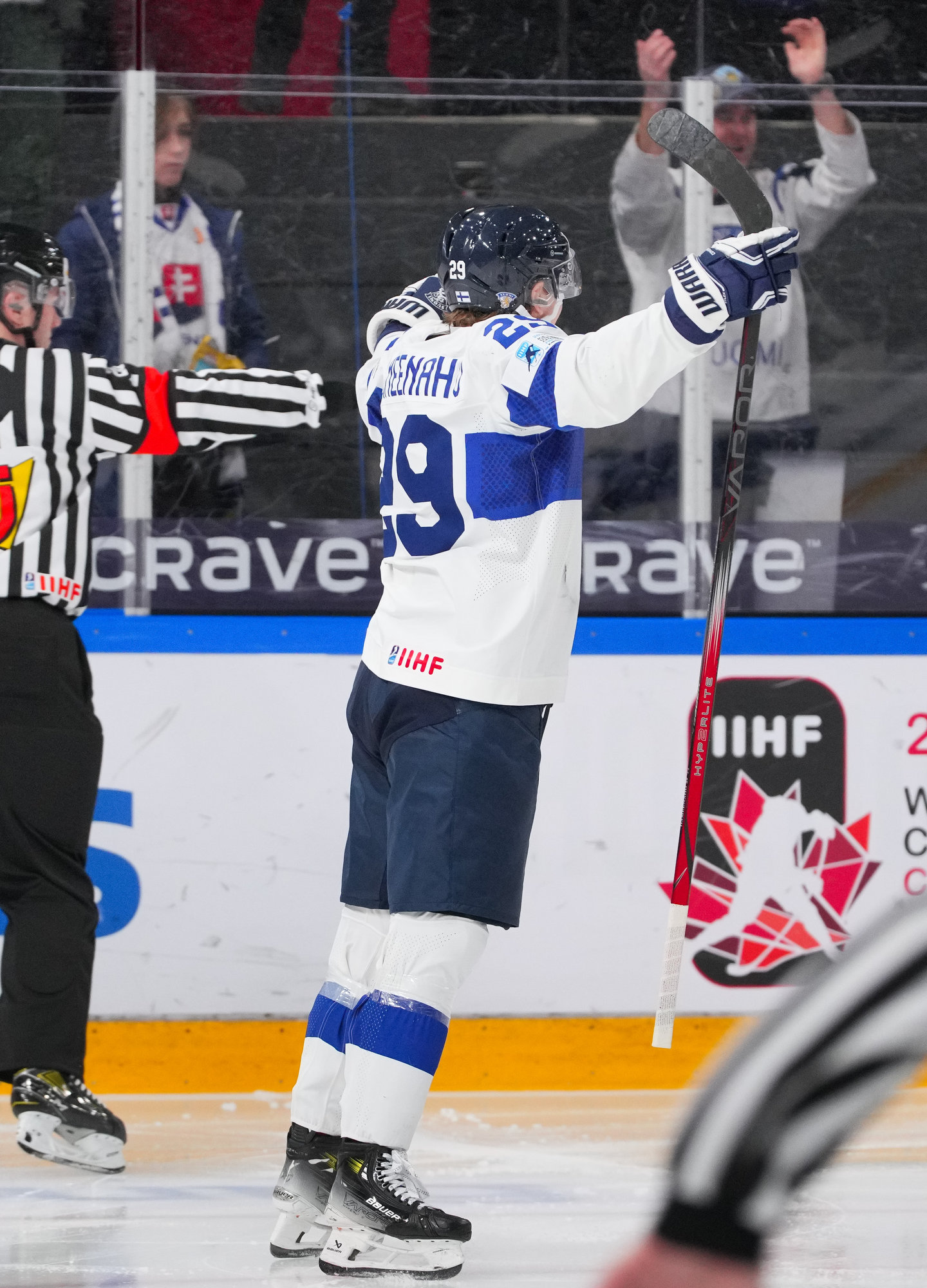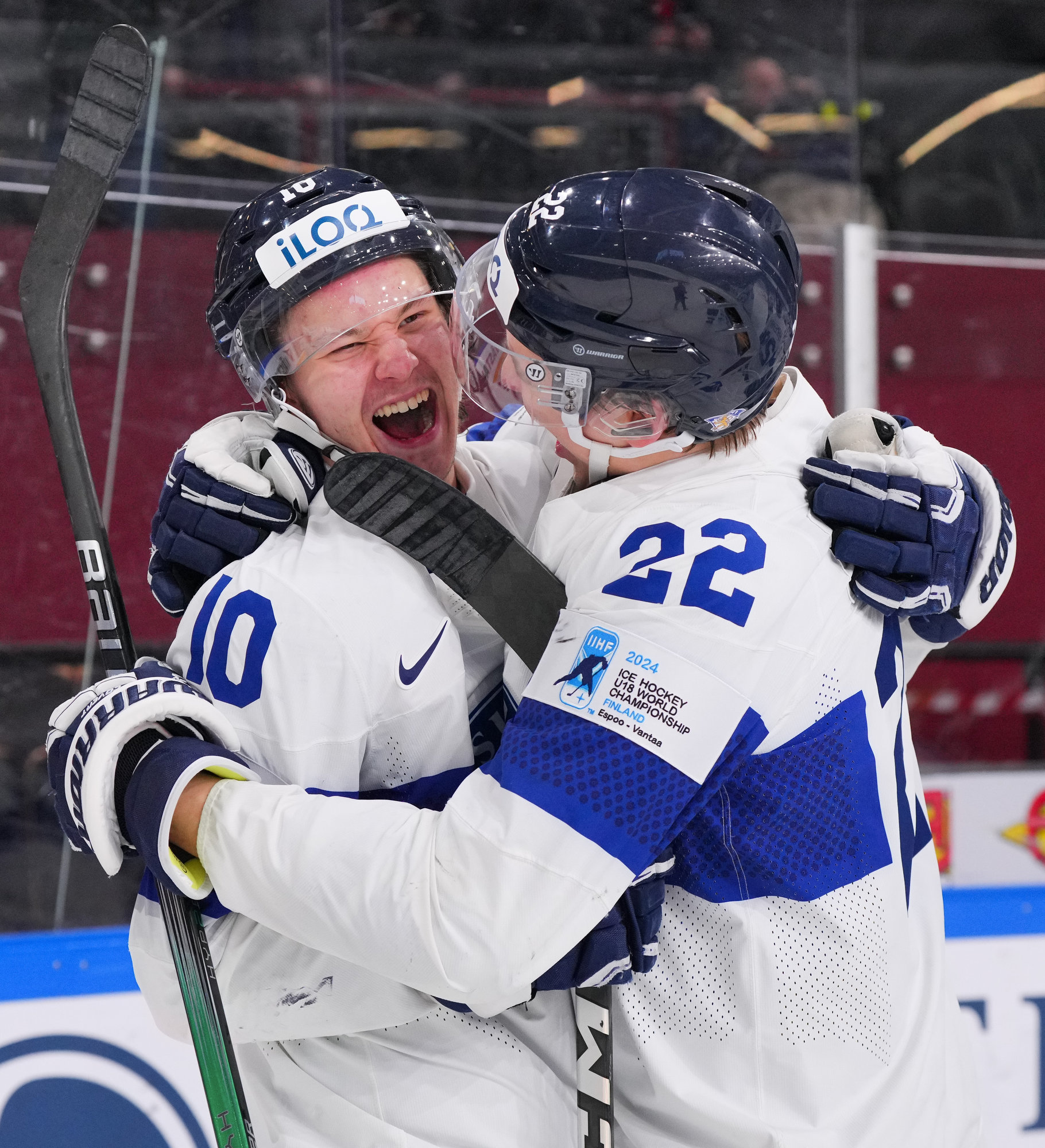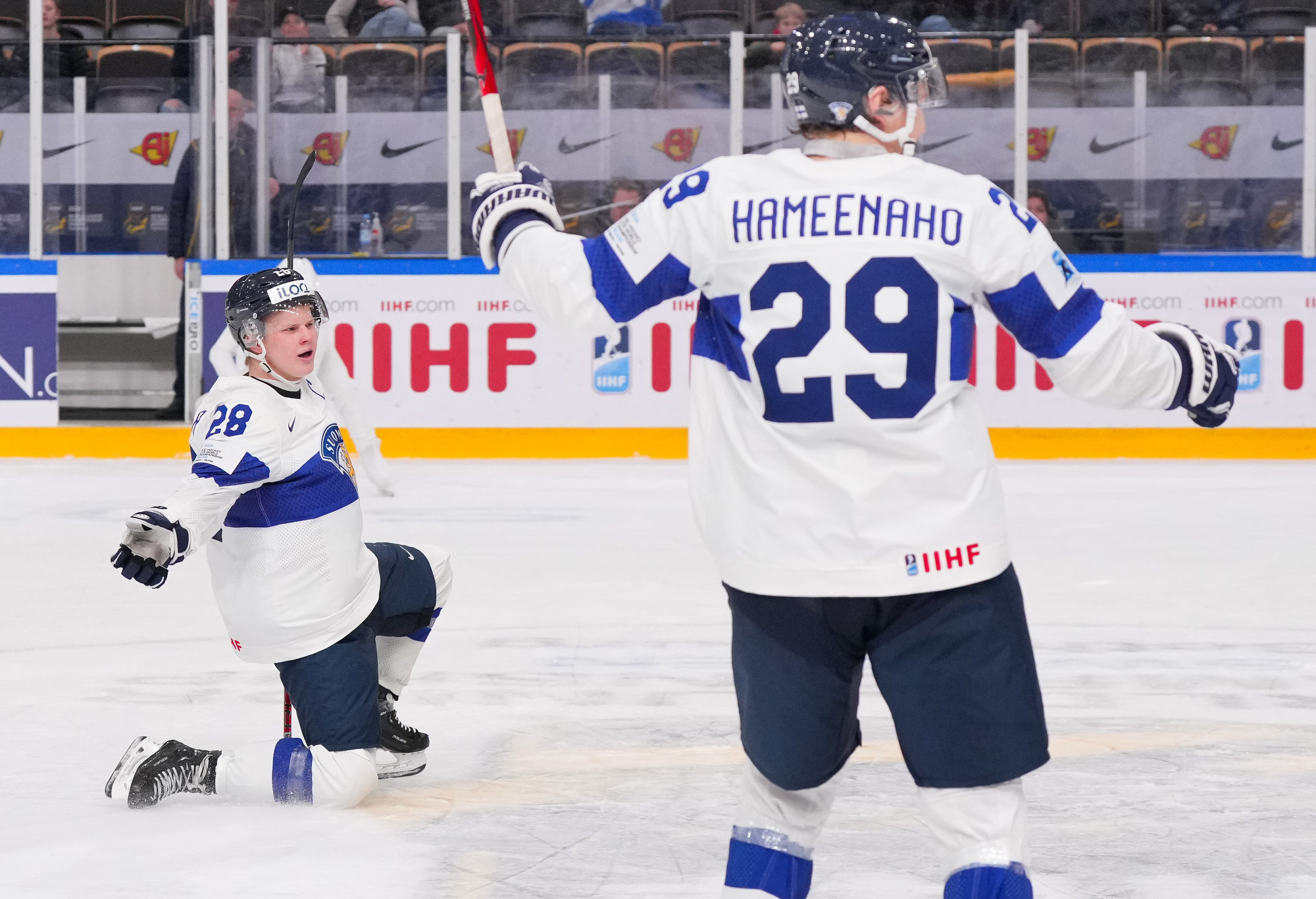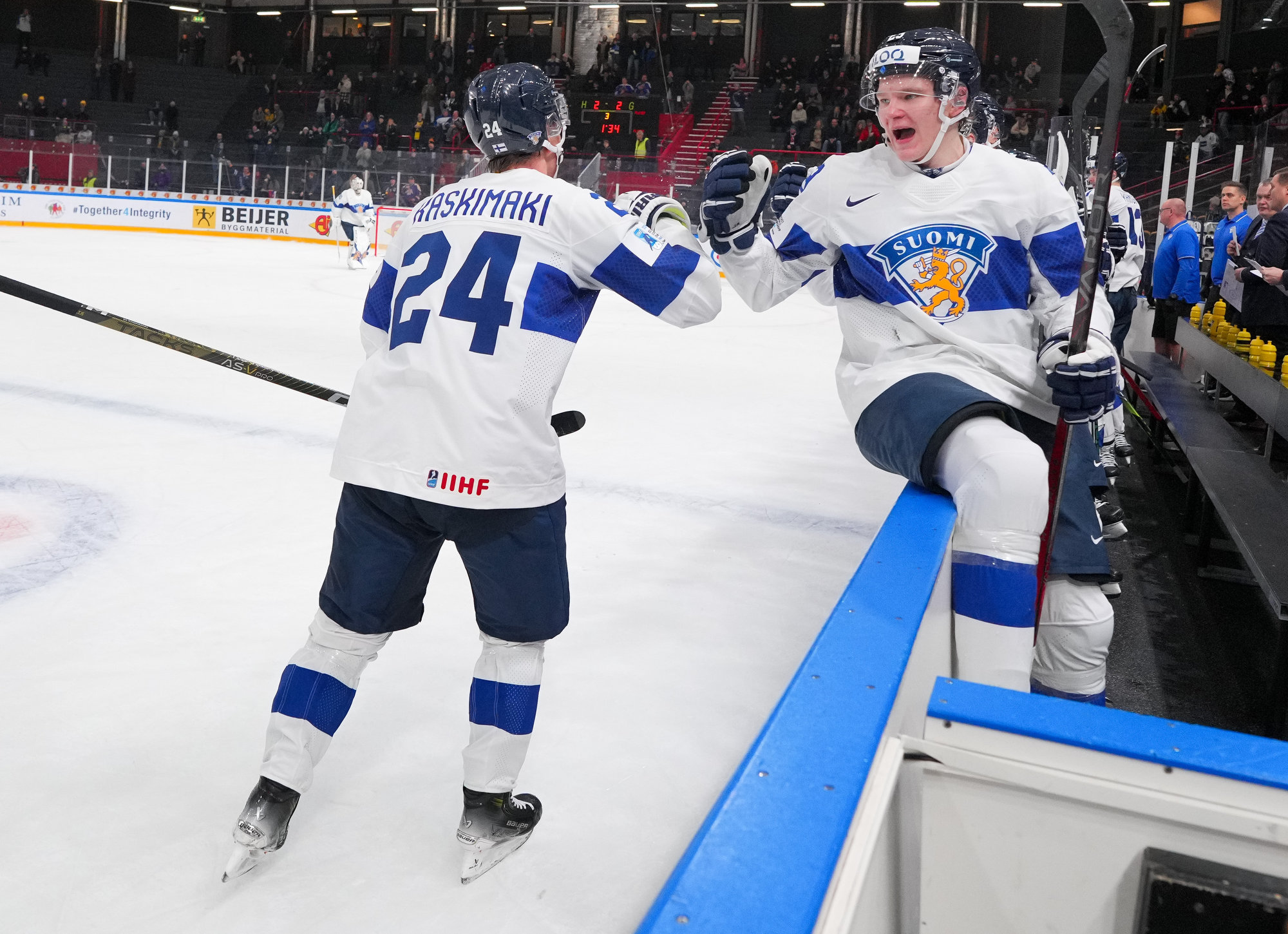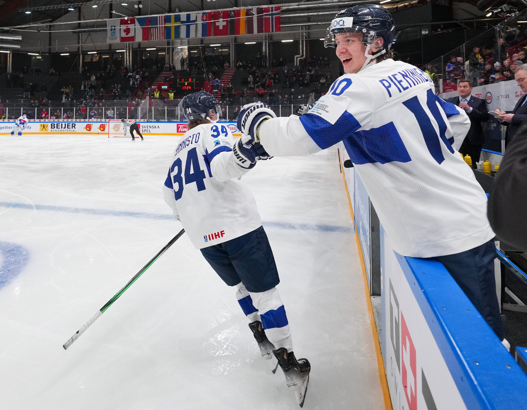 Finland's Tommi Mannisto (#34, left) celebrates after scoring a second-period goal in a 4-3 quarter-final win over Slovakia at the 2024 IIHF World Junior Championship in Gothenburg, Sweden.