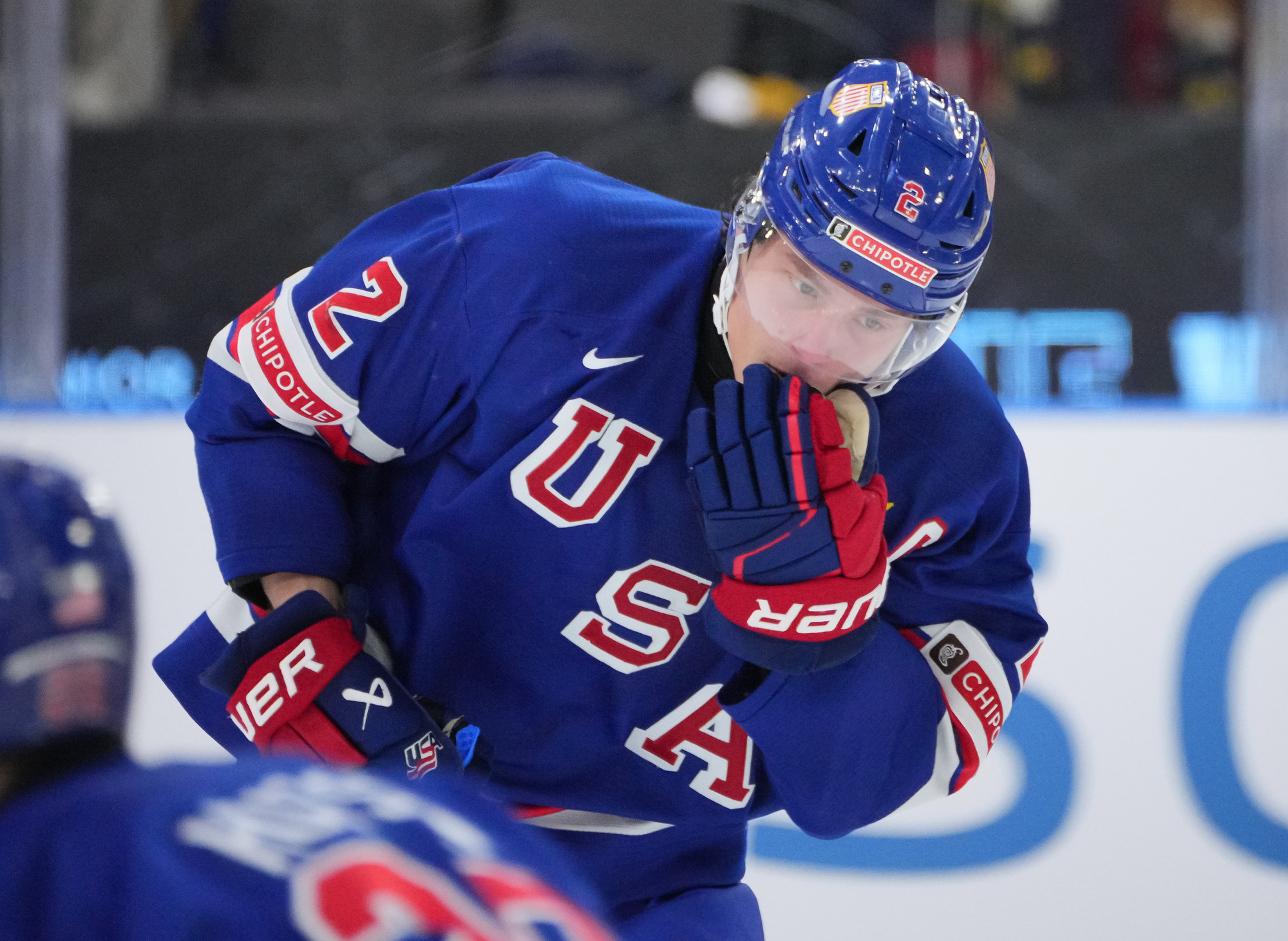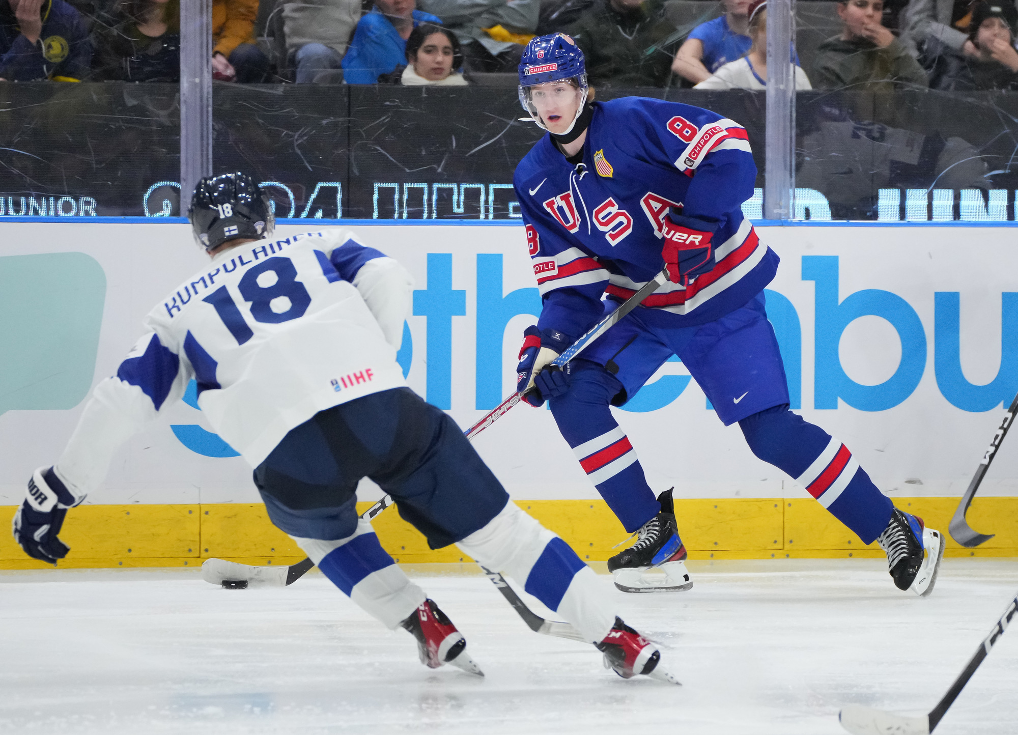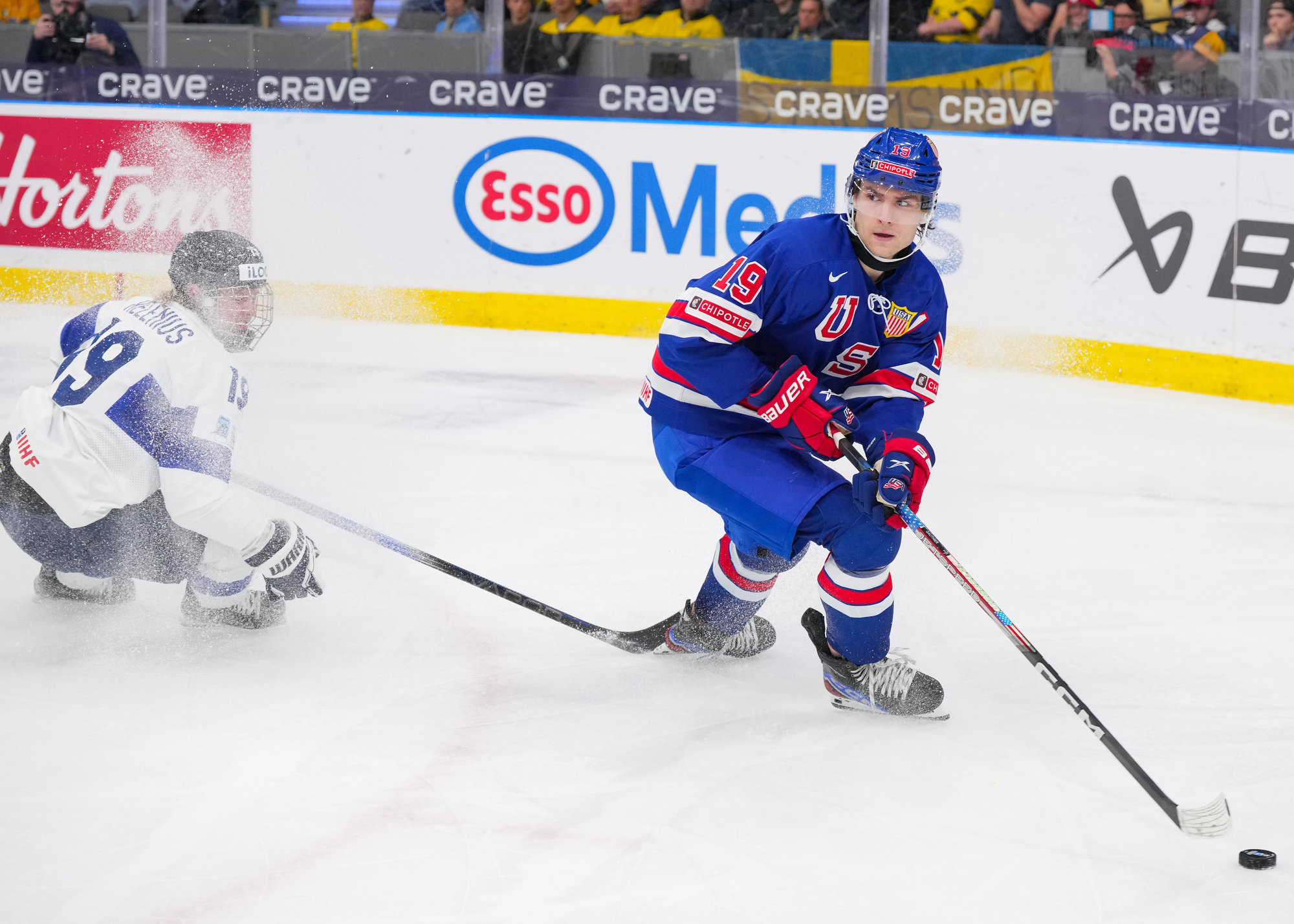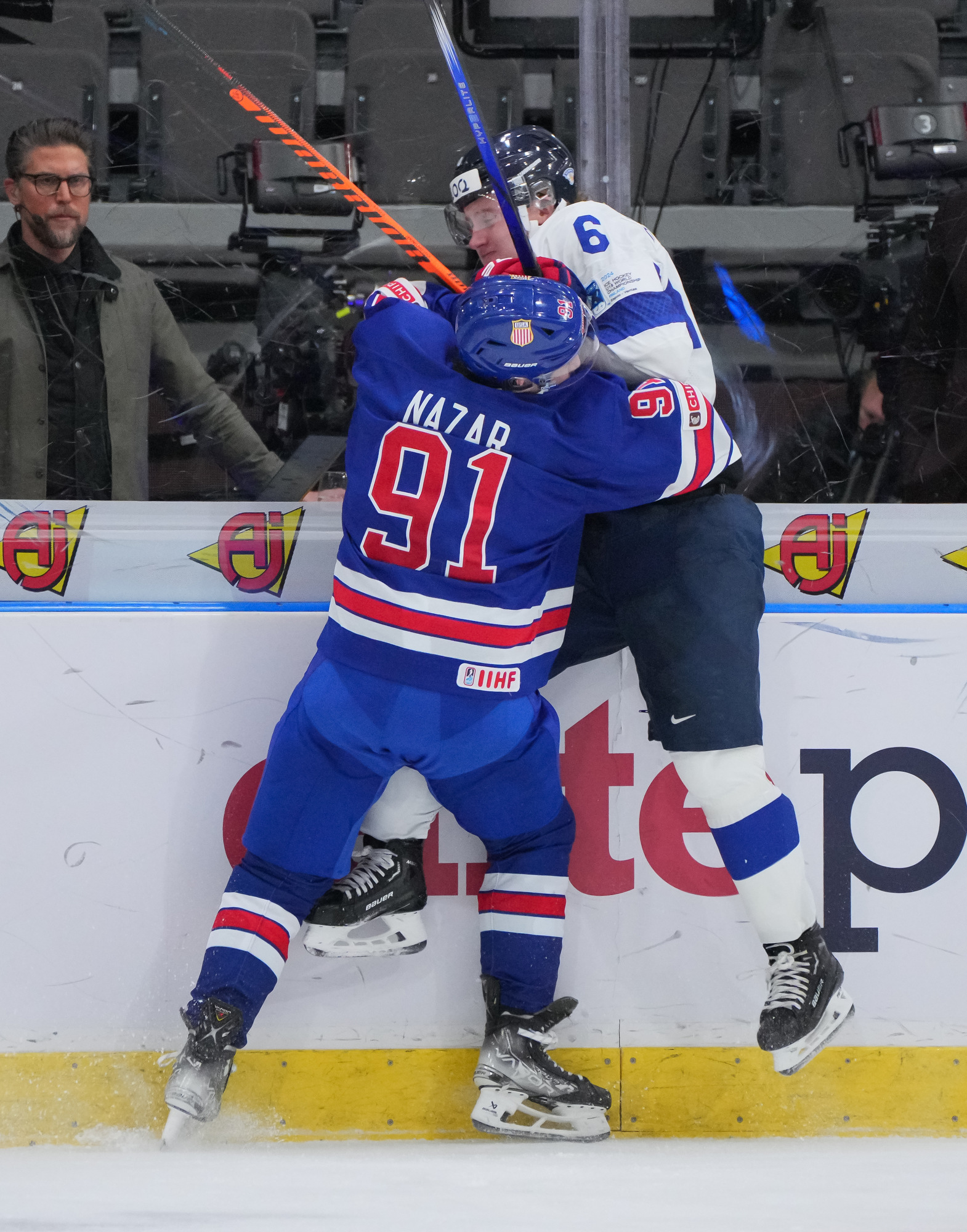 Quinn Finley, Will Smith, and Oliver Moore all had great chances to score in the first half of the period but couldn’t beat Kokko, who was sharp. But when the Americans got their first power play, they clicked in impressive fashion. Jimmy Snuggerud blasted a one-timer over the goalies’ glove at 12:10 to halve the lead, and four minutes later one of many defensive lapses by the Finns gave the U.S. another opening.