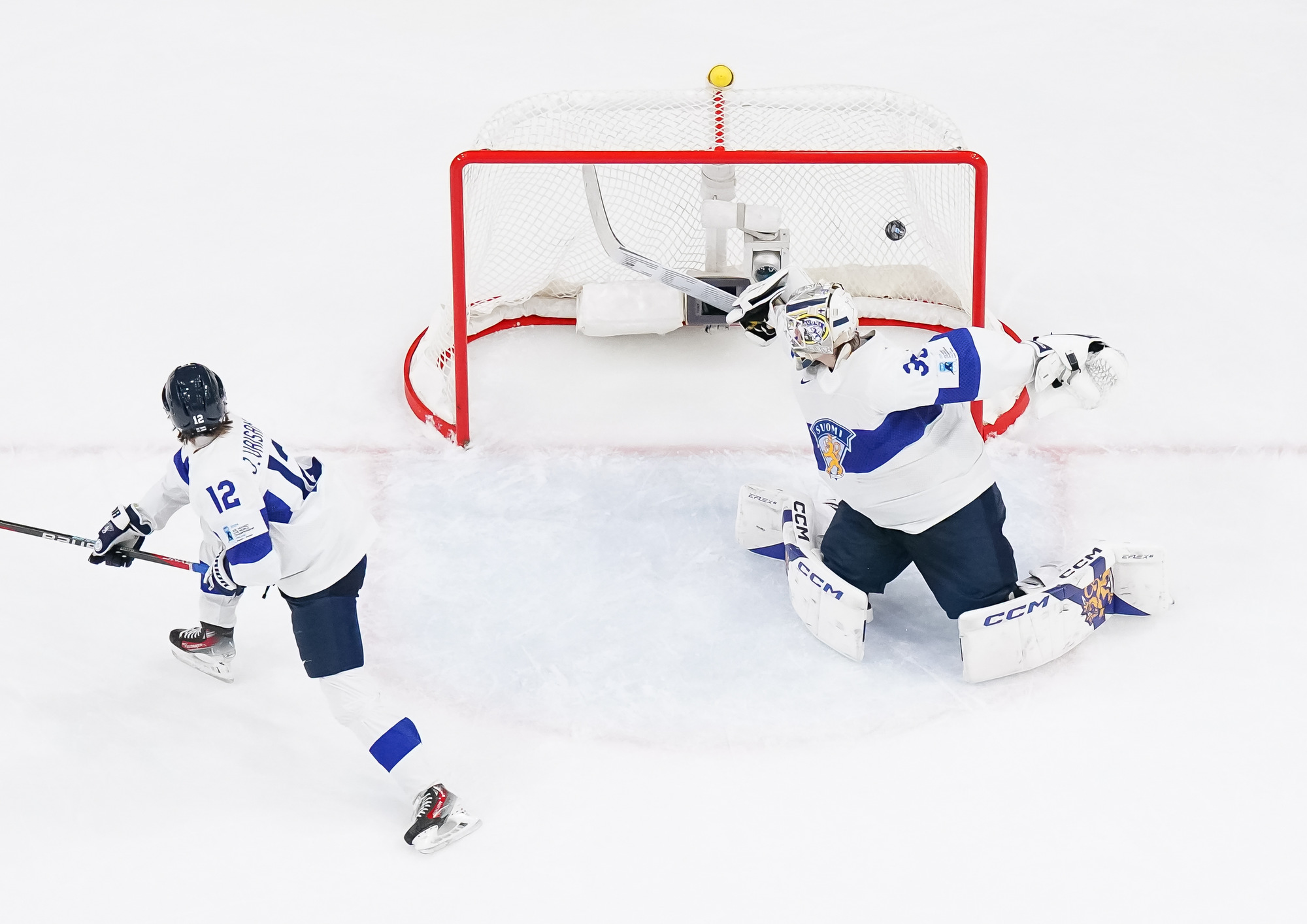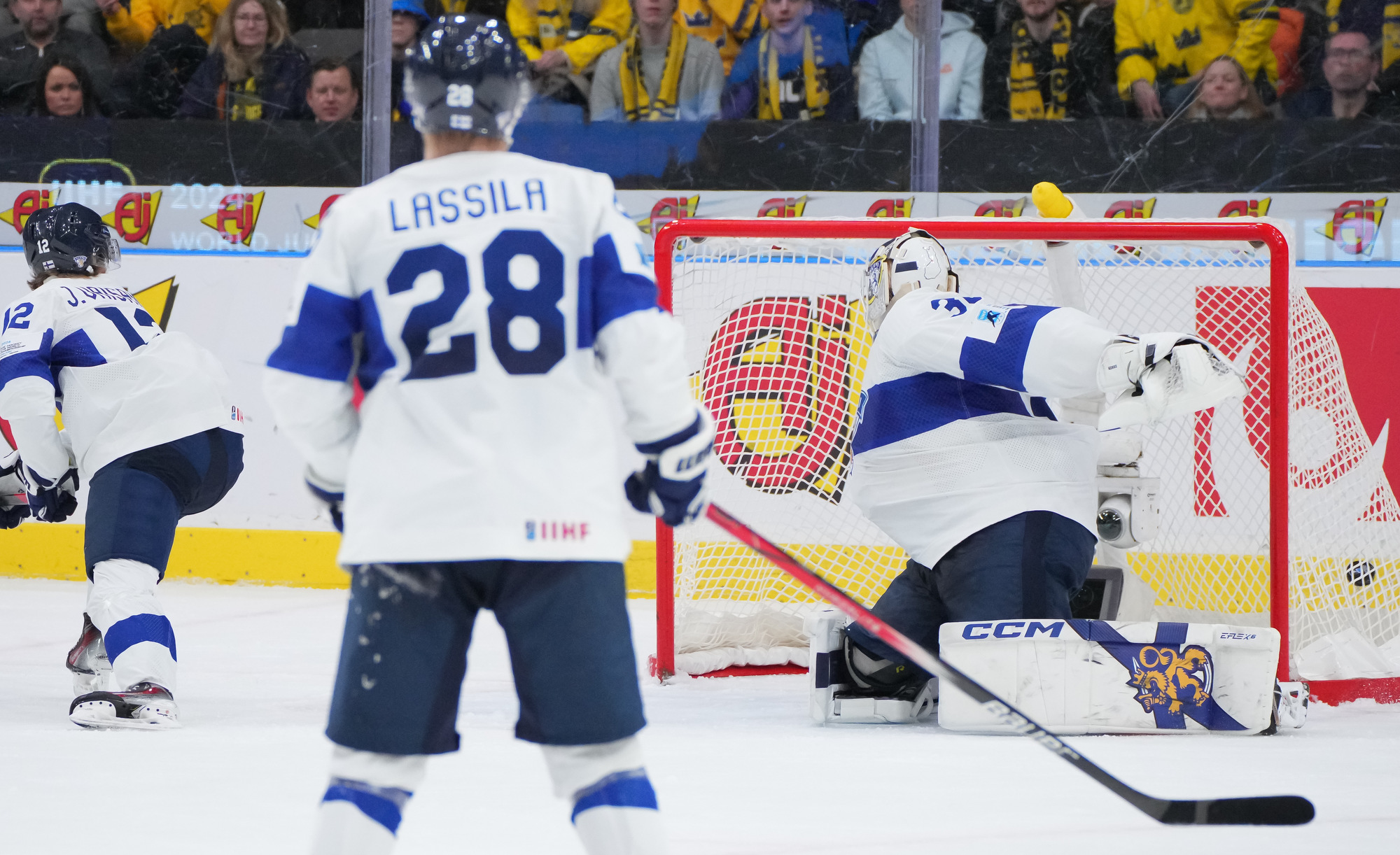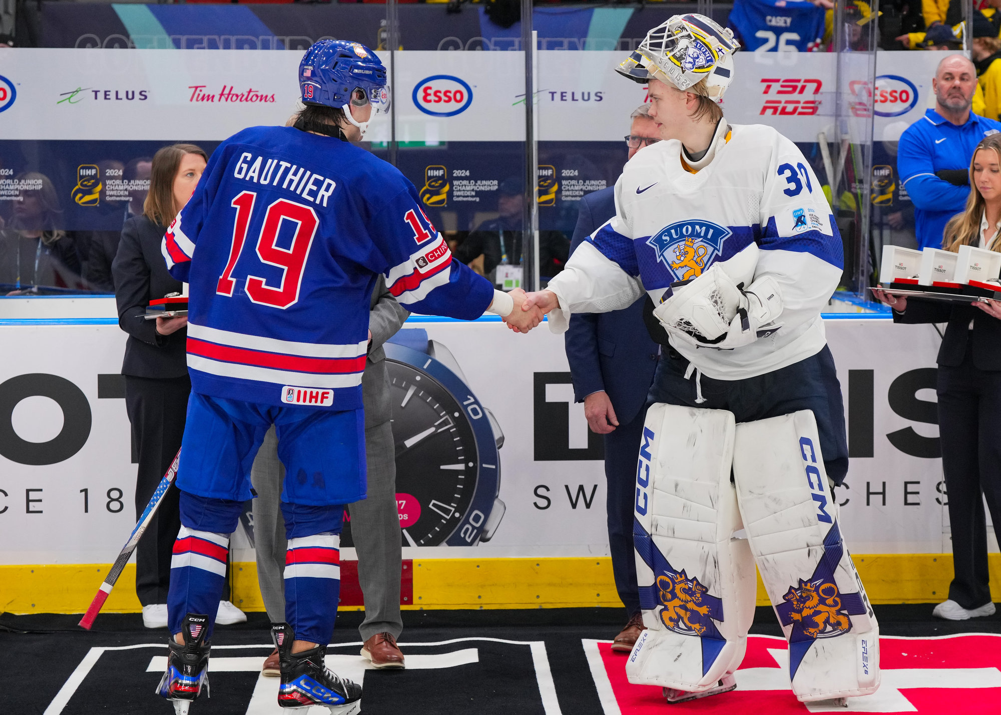 Gauthier skickade iväg ett högt skott över handsken på Niklas Kokko med bara 3:13 kvar under ordinarie speltid. Finländarna ledde 2–0 efter första perioden men tappade ledningen halvvägs genom matchen.