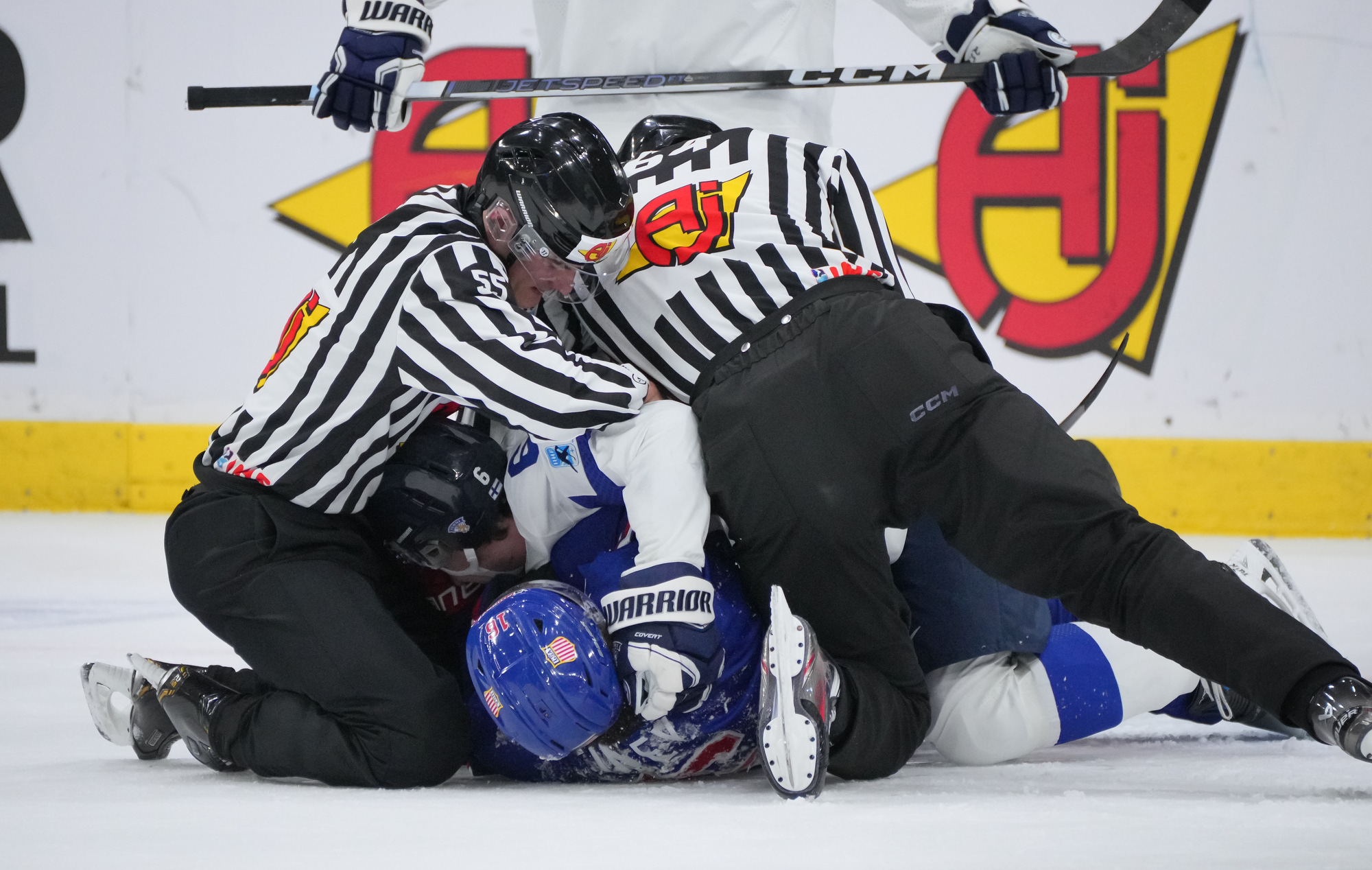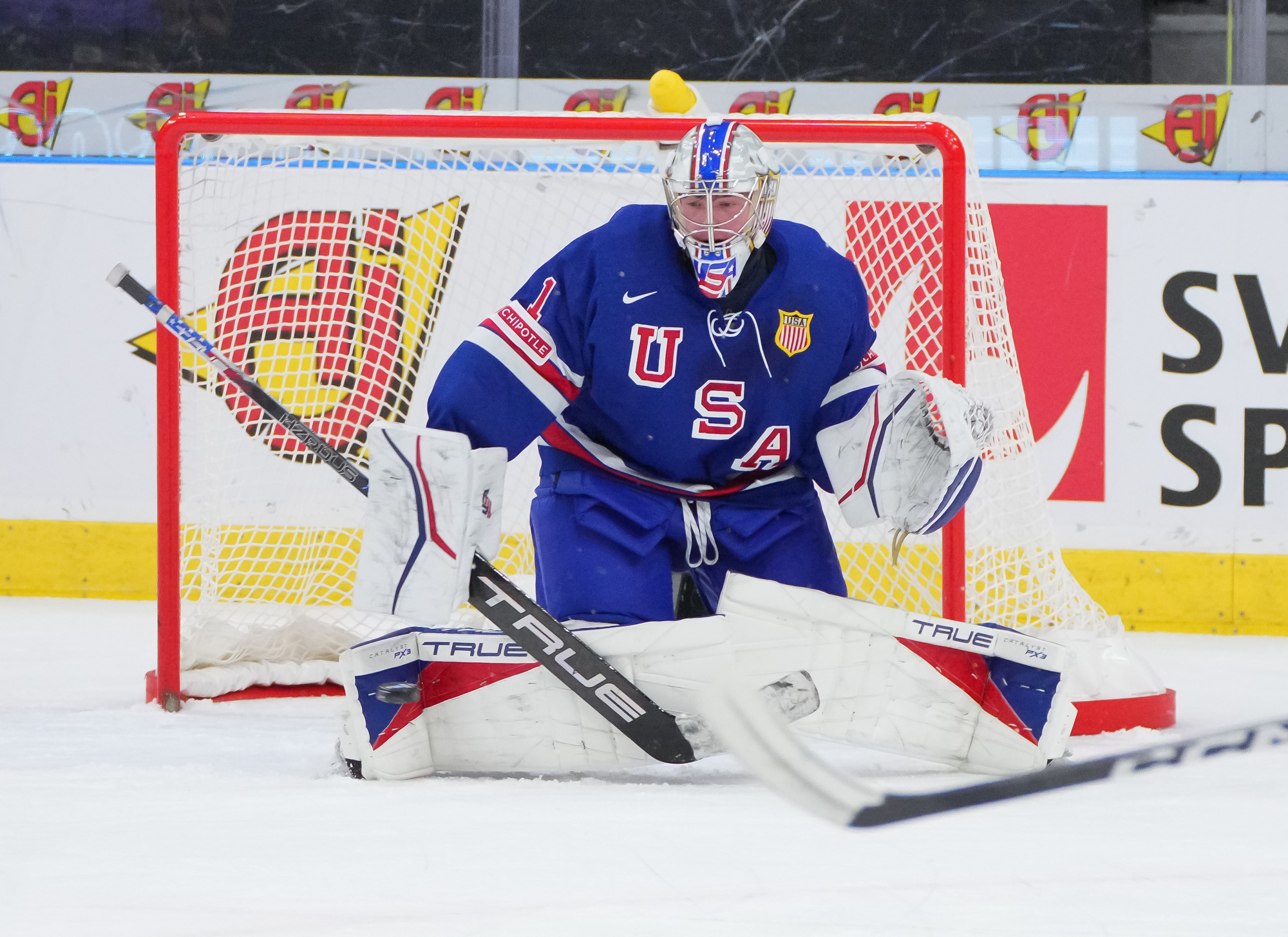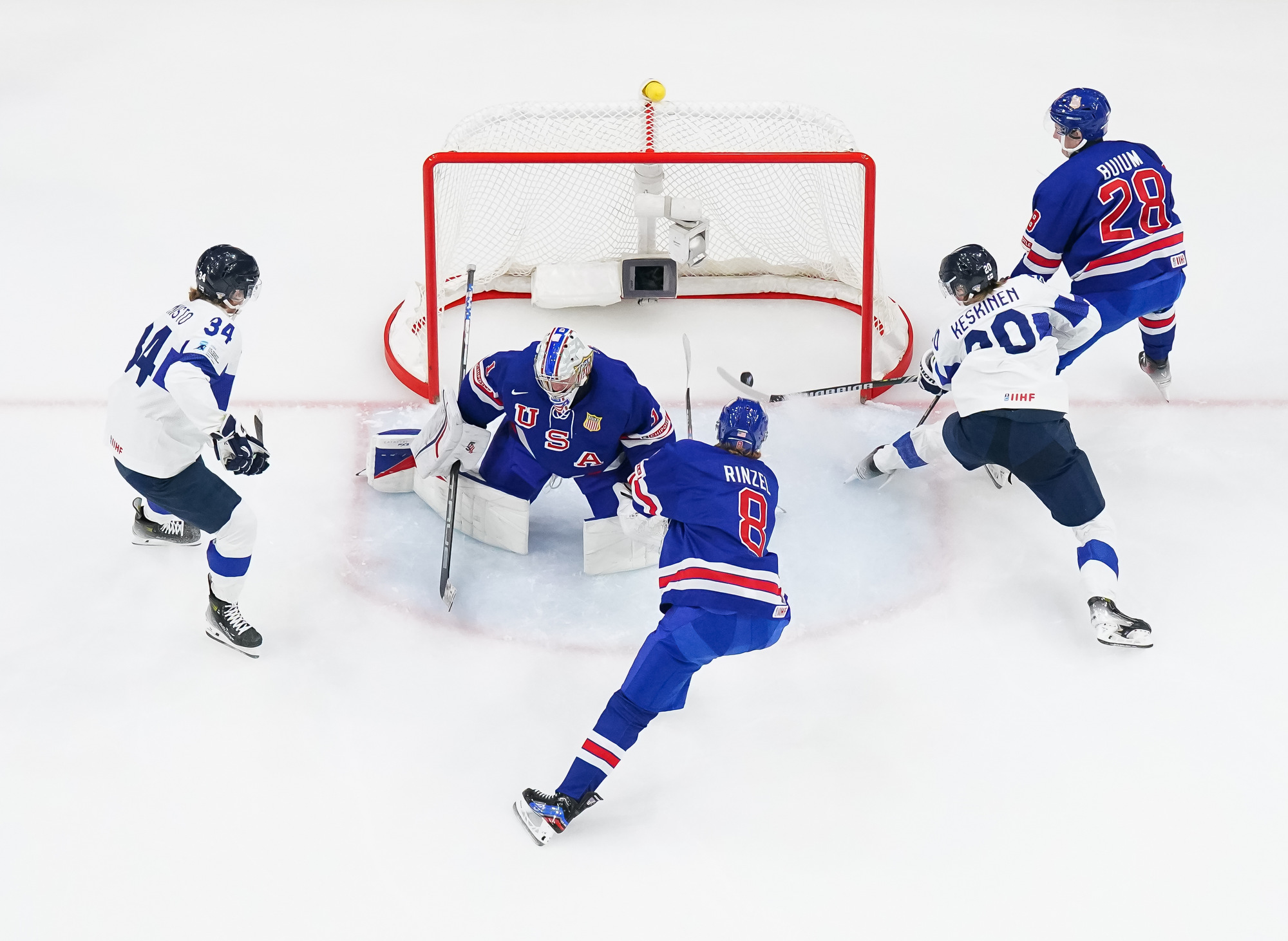 Tommi Mannisto snodde pucken från Sam Rinzel och överlistade Trey Augustine med ett snabbt skott, men pucken tog i ena stolpen, och sedan den andra, för att slutligen stanna centimeter från mållinjen. Oiva Keskinen knackade sedan in den i nät vid 1:51. Finländarna fortsatte att sätta press och hade mycket puckinnehav i amerikanernas ände, och Augustine fick vara på tårna för att inte låta siffrorna rinna iväg.
